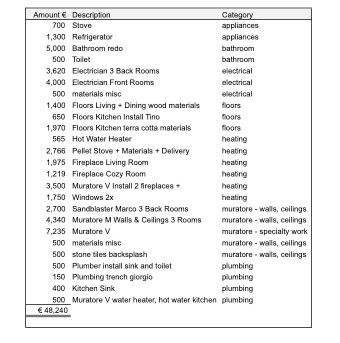 In July 2018, we bought our 6,000sqft cascina with more than 10 acres of land, two wells, and outbuildings for the equivalent of US$190,000. I bought the house with a friend and we split the cost. When we bought it, it was livable but it needed a heating system, upgraded electrical, minor plumbing repairs, and for us -- lots of cosmetic work. For my half of the house – the downstairs section of 3,200 sqft, -- I spent $55,000 on renovations. We have not done any renovations yet to the exterior of the house. See a breakdown and description of these costs below.