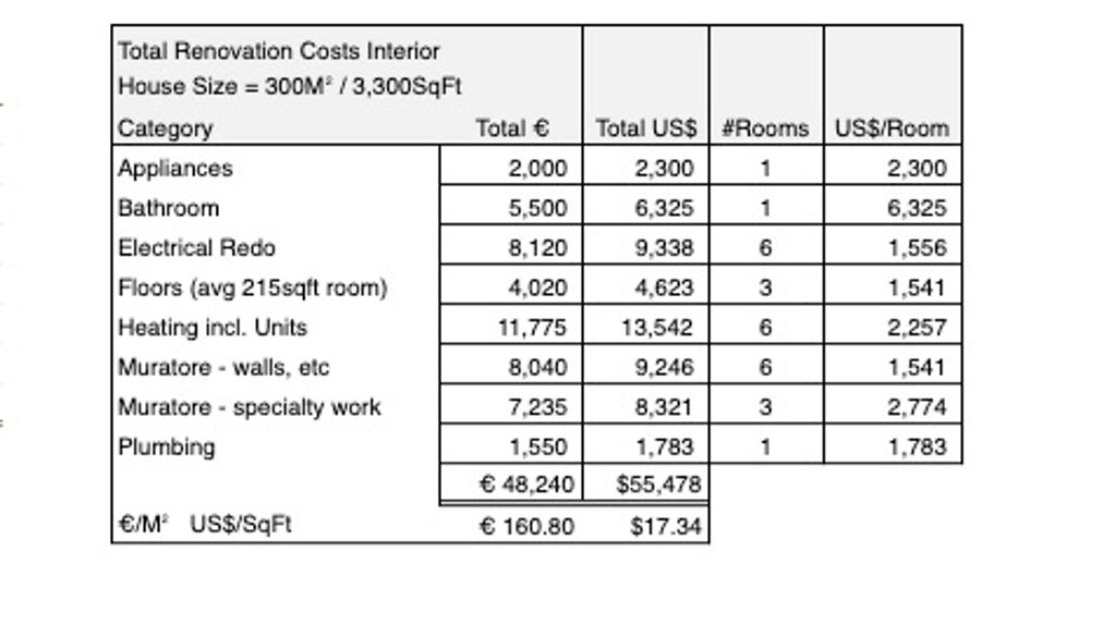 As a general rule, if you are not doing any work yourself, assume between Euros 500/m2 (US$48/sqft_ for basic and Euros 1,200 ($US117/sqft) for tip-to-toe renos. This upper figure does not include additional budget for hi-end finishes.